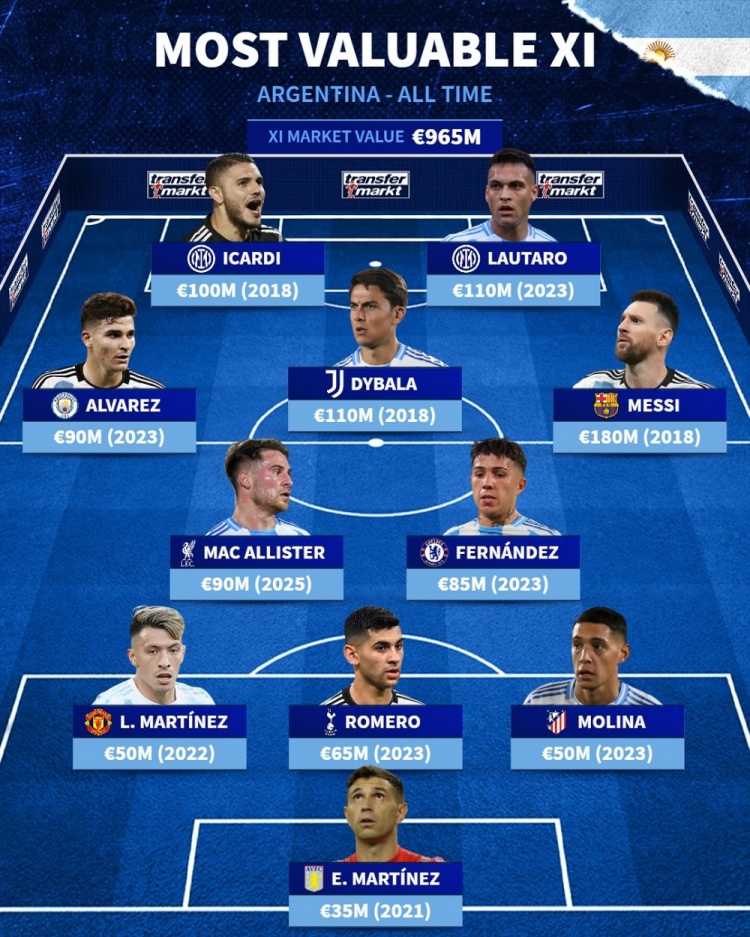 2025-03-26 12:03:31阿根廷歷史德轉身價最高陣:梅西領銜,勞塔羅、迪巴拉、二弟在列