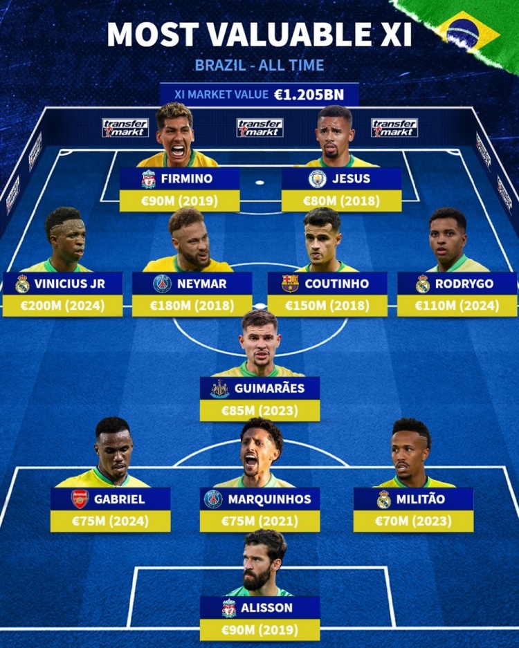 2025-03-26 12:03:32巴西歷史德轉身價最高陣:內馬爾、維尼修斯在列,總價12億歐