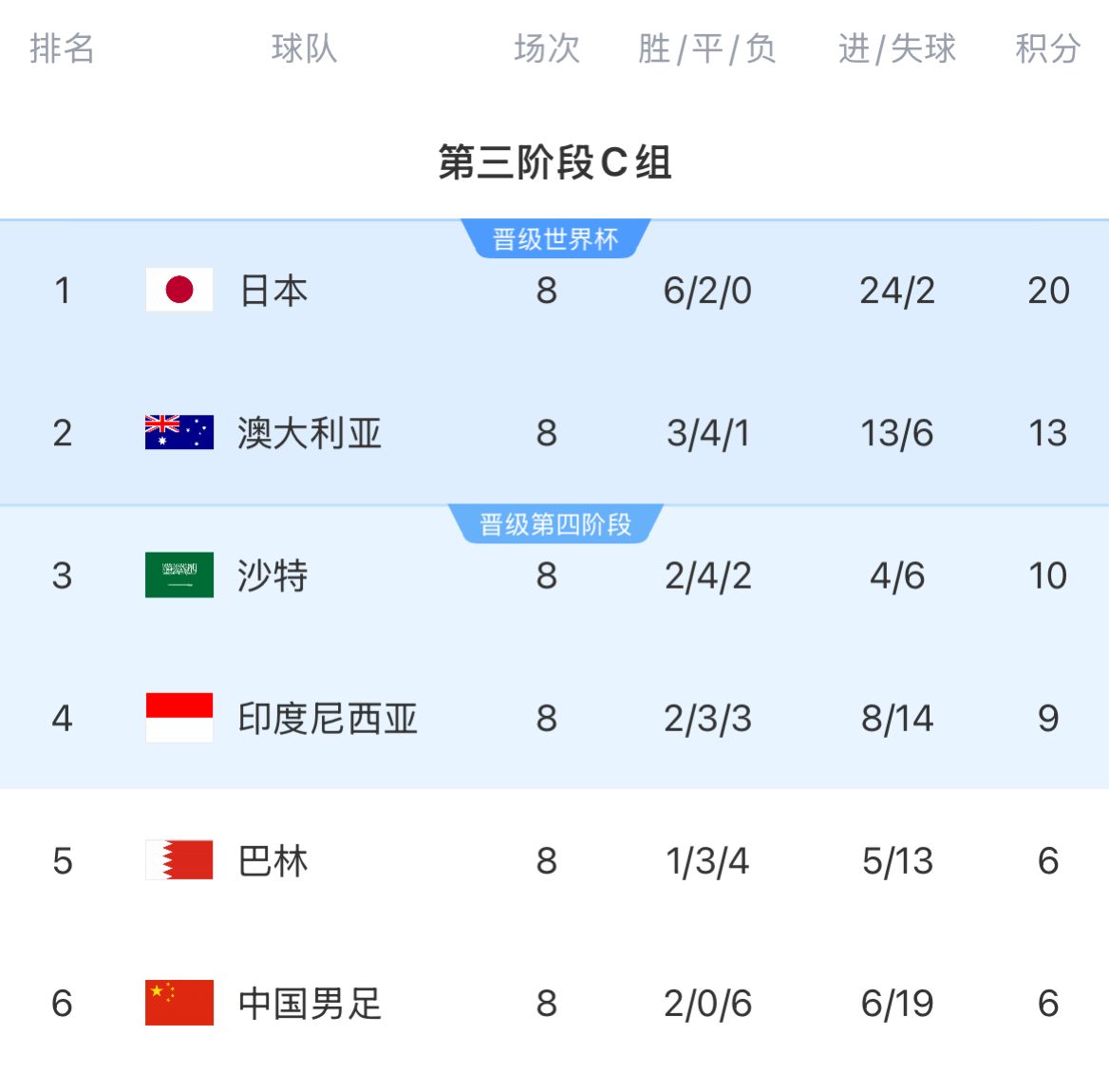 18強賽積分榜:中國巴林6分倒一倒二 印尼9分位居第4 沙特10分第3