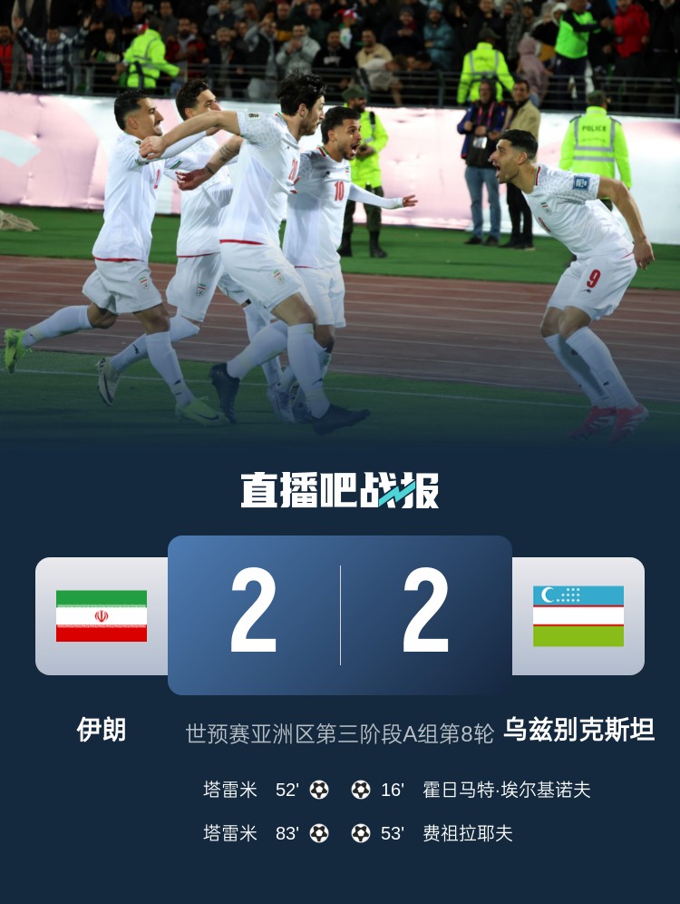 伊朗2-2戰平烏茲別克斯坦,伊朗提前鎖定直通世界杯!本場塔雷米雙響。