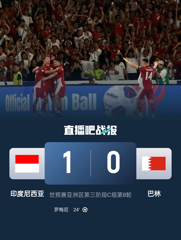 世預賽亞洲區第三階段C組第8輪,羅梅尼單刀破門,印度尼西亞1-0巴林。印尼此役后領先國足3分。