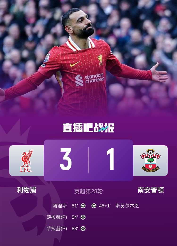 英超第28輪,利物浦3-1逆轉南安普頓。上半場,利物浦防線出現失誤,斯莫爾伯恩破門;下半場,努涅斯破門+造點,薩拉赫點射,菅原由勢手球送點,薩拉赫點射再中。
