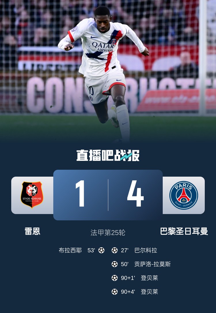 2025-03-09 02:25:112025年03月09日 25輪不敗!巴黎4-1雷恩先賽16分領跑 登貝萊替補補時3分鐘雙響