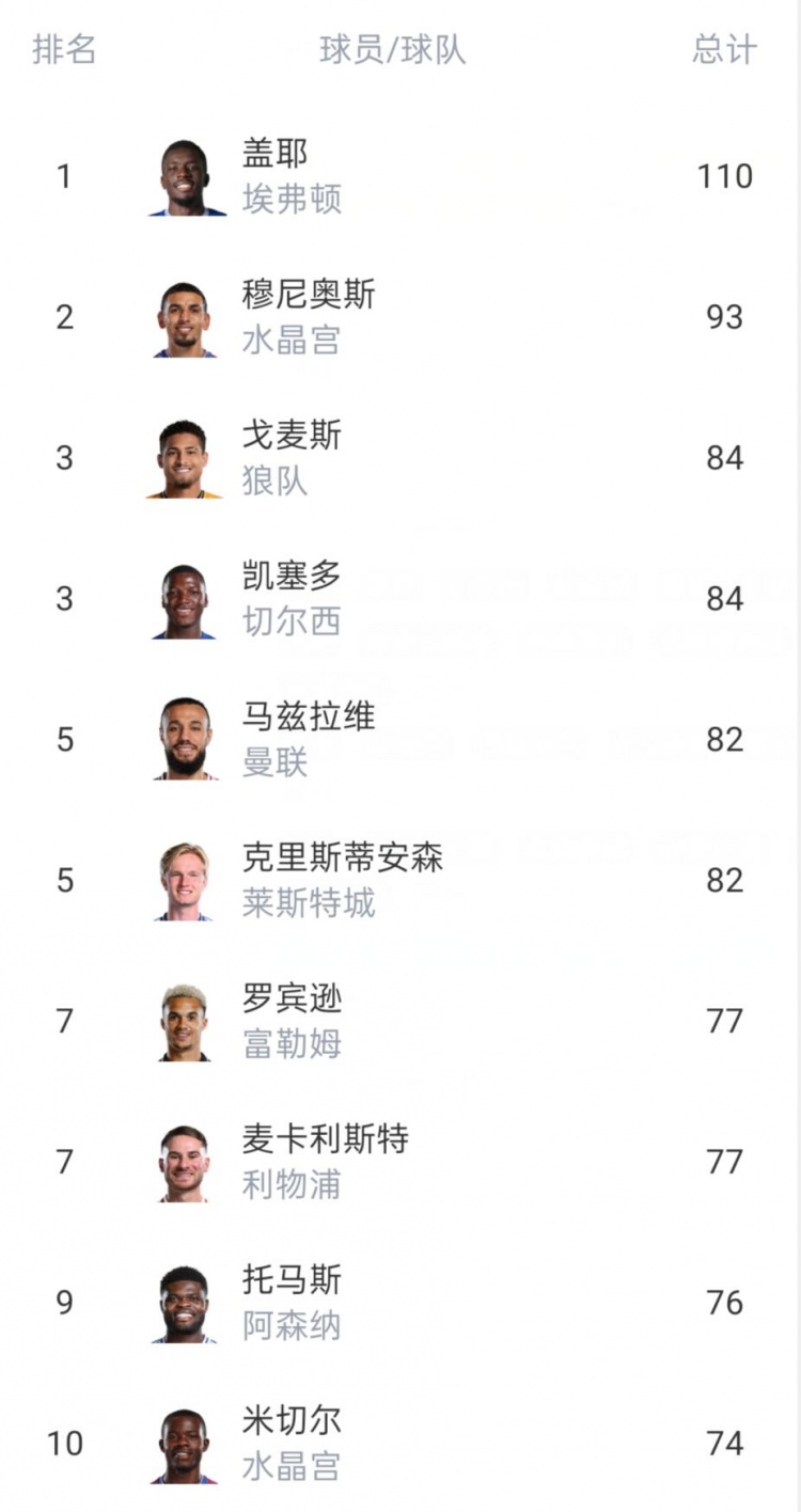 2025-04-01 12:01:11110次!埃弗頓中場蓋耶是本賽季英超唯一搶斷次數超100的球員