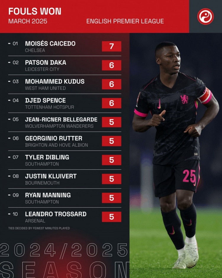 2025-04-01 12:01:17英超3月制造犯規次數榜:凱塞多7次居首,庫杜斯6次&特羅薩德5次