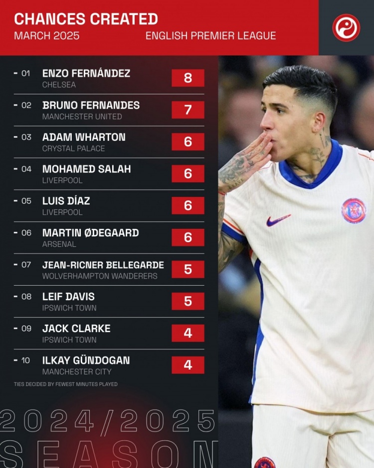 2025-04-01 12:01:28英超3月創造機會排名:恩佐8次居首,B費7次&薩拉赫6次