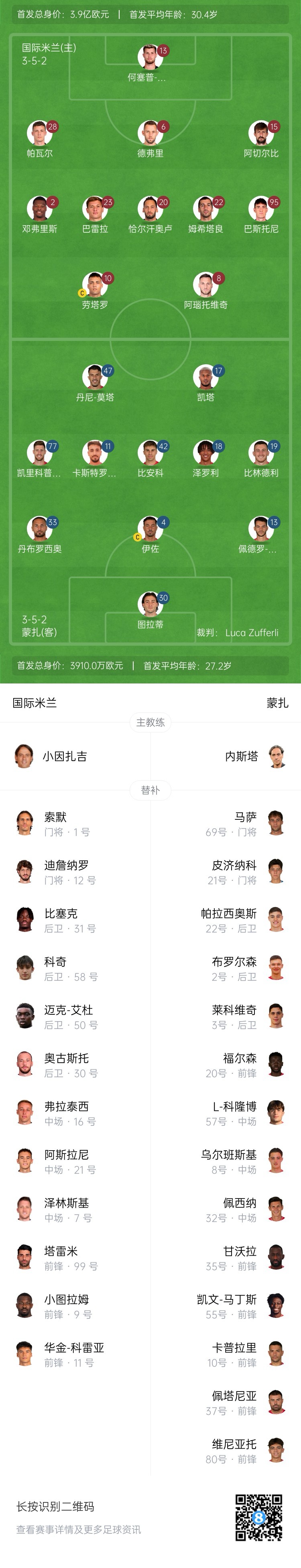 3月9日訊 意甲第28輪,國米主場迎戰蒙扎比賽即將打響。賽前首發出爐。